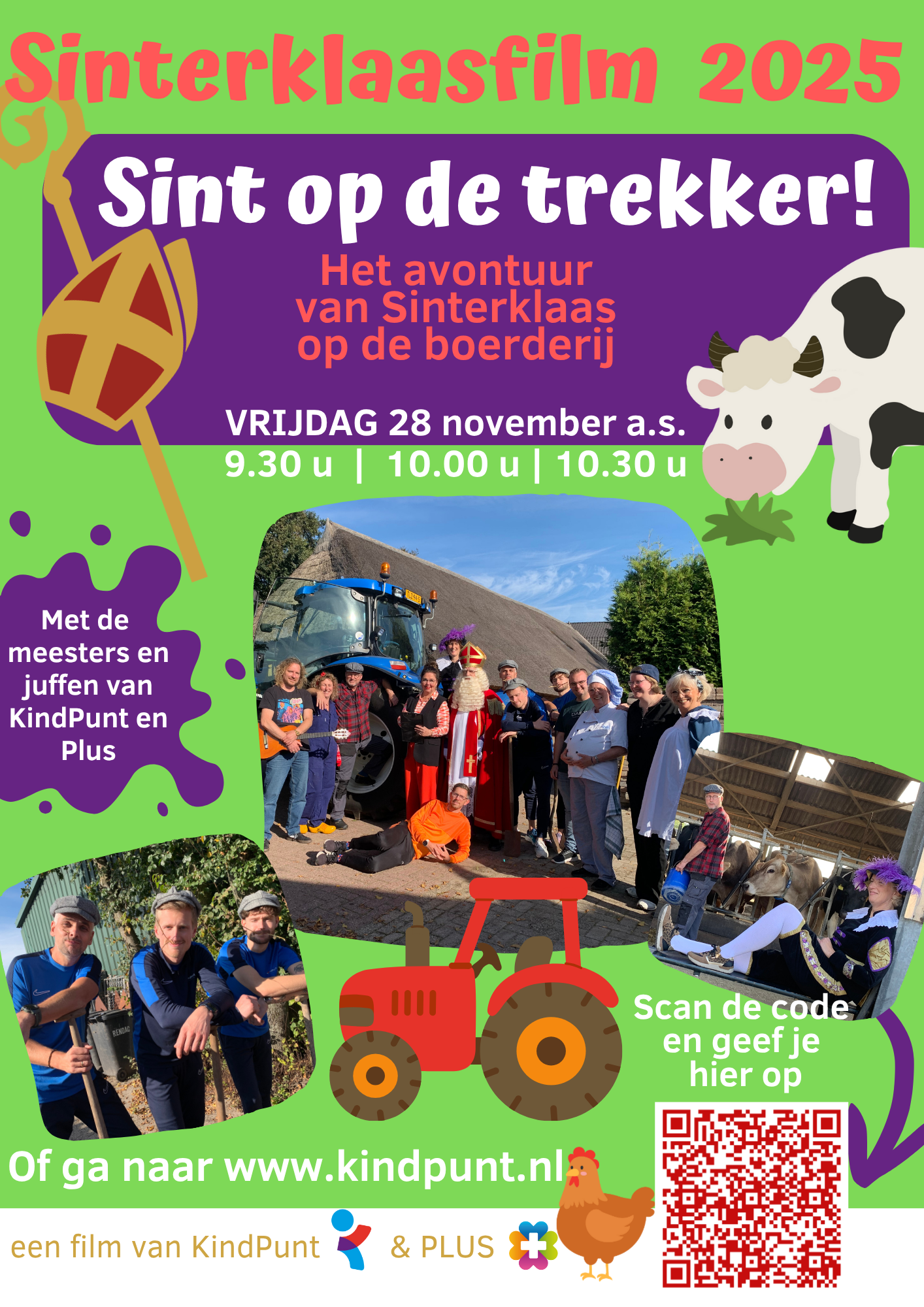 Ook dit jaar is er weer een leuke film van een avontuur met Sinterklaas, Piet en de meesters en juffen van Plus en KindPunt.Dit jaar een avontuur op de boerderij!